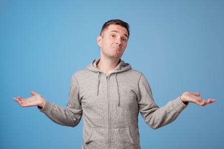 Man with an innocent expression on face spreads arms to the sides and looks at the camera in bewilderment. Blue background.
