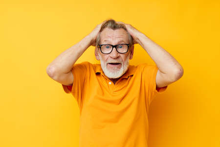 Senior grey-haired man posing yellow tshirt glasses yellow background