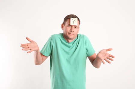 Beard man question mark in head, solution problems. Thinking man with question mark on blue background. Man with question mark on forehead looking up. Paper notes with question marks