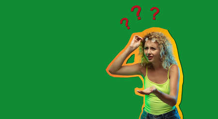 Young man expressing doubt on his face with question symbols around his head. Portrait Image for advertising, web or commercial use.