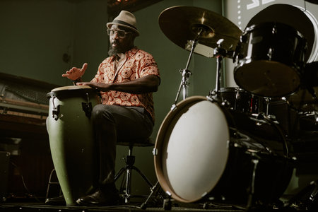 Low angle view of bearded African American man playing conga during jazz performance in bar