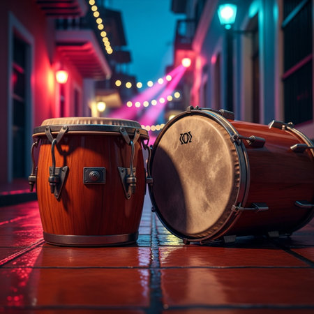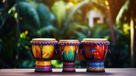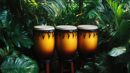 A trio of vibrant conga drums stands out amid lush green plants, embodying the spirit of music and rhythm in a tropical paradise, perfect for cultural and artistic themes.