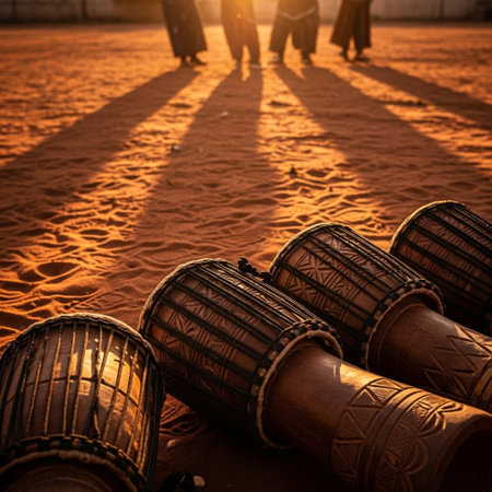 As the golden sun sets, the experienced hands of a musician beat a powerful rhythm on a traditional djembe drum.