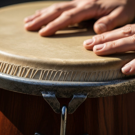 A Hero Detail composition focusing on the intricate textures of a vintage bongo drumhead. A musician