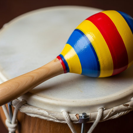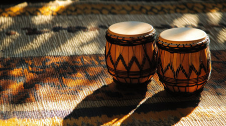 This captivating image features a pair of handcrafted drums resting on a vibrant woven textile, showcasing intricate patterns and warm tones.