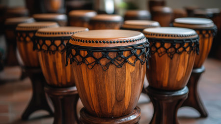 A captivating arrangement of handcrafted wooden drums showcases the intricate designs and natural beauty of traditional percussion instruments in a cozy setting.