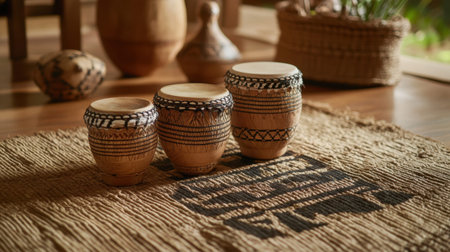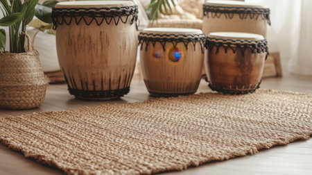 A serene living room scene featuring rustic drums arranged on a woven rug, exuding a warm and inviting atmosphere perfect for musical inspiration and relaxation.