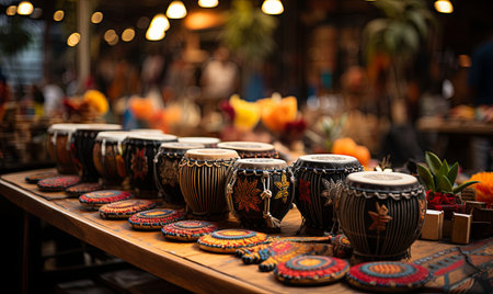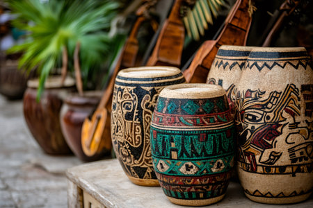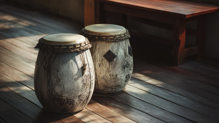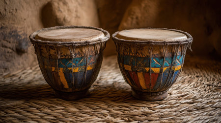 Explore a pair of traditional handcrafted drums featuring unique patterns and textures, set within a rustic and warm indoor environment, reflecting cultural artistry.