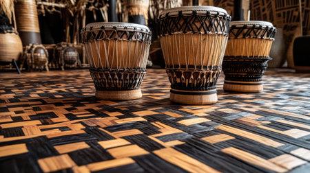 This image showcases traditional drums beautifully arranged on an intricately patterned wooden floor, highlighting cultural craftsmanship and musical heritage.