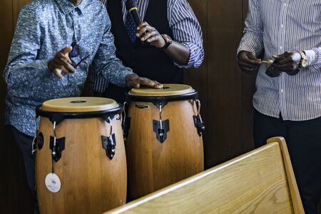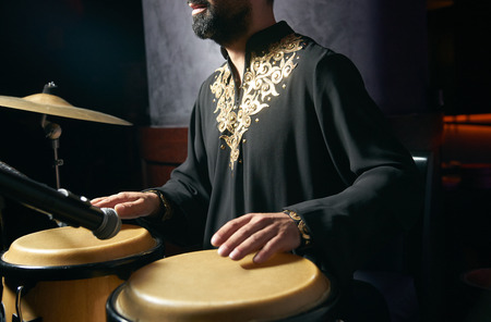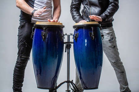 Performers playing bongo drums. Close up of musician hand playing bongos drums. Afro-Cuba, rum, drummer, fingers, hand, hit. Drum. Hands of a musician playing on bongs