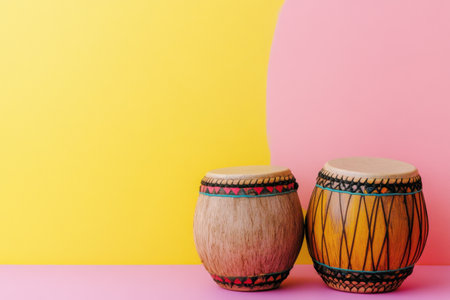 Two beautifully crafted hand painted drums sit side by side on a pink surface creating a striking contrast with a vibrant yellow wall behind them. The intricate designs on the drums showcase traditional artistic techniques and celebrate cultural heritage. This playful arrangement adds a lively touch to any space inviting an appreciation for music and artistry