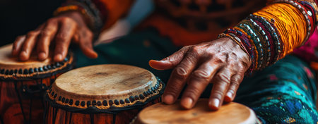 A Close up of hands playing traditional drums with colorful bracelets, showcasing cultural expression and rhythm