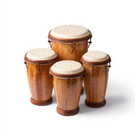 A vibrant set of wooden drums featuring intricate textures and patterns, perfect for music-related projects, creative pursuits, or community gatherings.