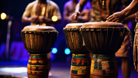 Hands skillfully beat a djembe drum, adorned in vibrant African attire, against a warm, dark backdrop.