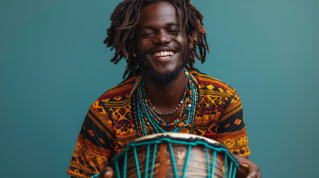 Happy African musician joyfully playing the conga drums during a live music performance on stage, smiling with passion and energy.