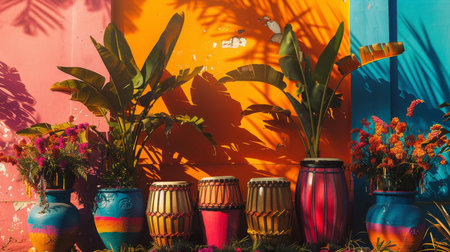 Sun-drenched tropical scene featuring brightly painted drums, vivid flowers, and lush green plants against a colorful wall.