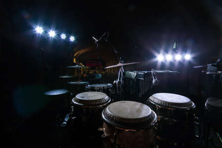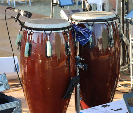 drums for percussion, drums for playing with hands, drums with microphones on a bokeh background
