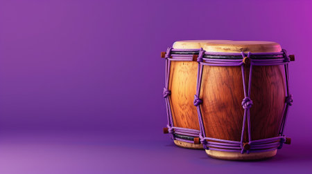 Two wooden djembe drums against purple background with ample space for text on right side