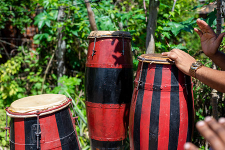 Brazilian atabaque being played by the hands of a musician. Feeling of power and speed. Constant pace. Acupe, Santo Amaro, Bahia.