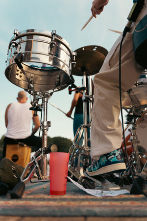 Salvador, Bahia, Brazil - February 02, 2023: candomble members are playing percussion instruments during the party for yemanja, in Salvador, Bahia.