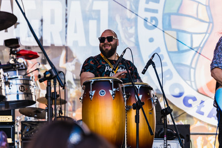 Wroclaw, Poland - May 1 2023: Artists and guitarists at main stage at open event Guitar Guinness World Record 2023 where record was beaten with 7967 guitars at market square