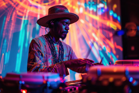 Cheerful Black man in hat playing conga in Afro-Cuban jazz band, medium closeup shot