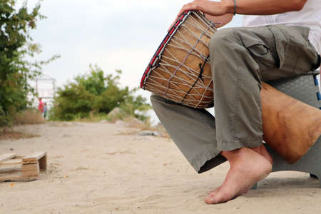 Closeup drummer male hands with jembe. Man is drumming on wooden ethnic drum. Percussion musical instrument. Musician is playing live ethno rhytm music. Summer festival concept. Modern art hobby.