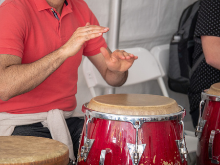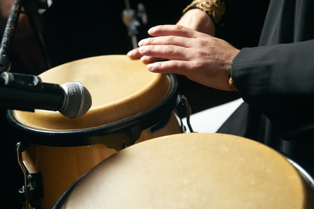 The black hands of an African-American play ethnic music on a djemba, a leather-covered plastic drum, an African musical instrument. high quality photo