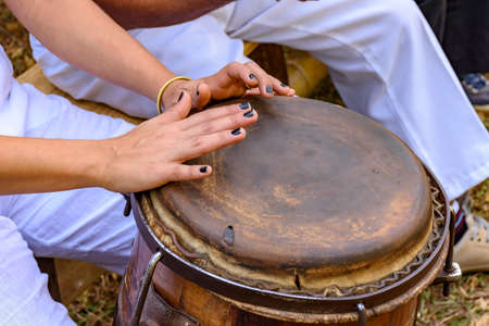 Percussionist playing a rustic and rudimentary percursion instrument atabaque during Afro-Brazilian cultural manifestation