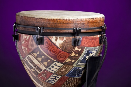 An African or Latin djembe drum with real skin head isolated against a spotlight purple background.