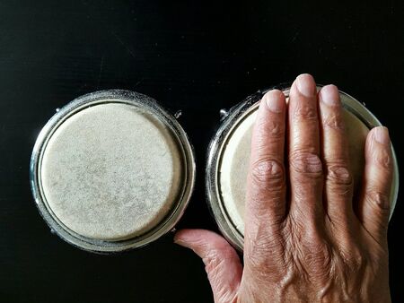 Old hand playing a toy conga
