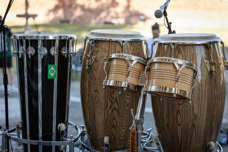 These are the beats of Brazil. Closeup shot of a musical performer playing drums with his band.
