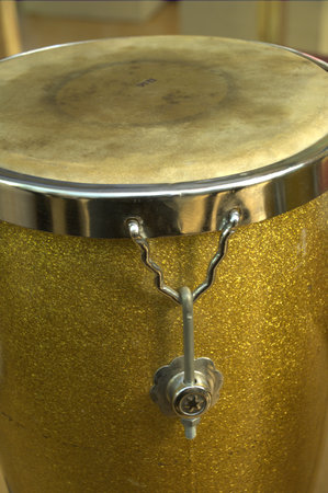 Drum in gold color, close-up photo of musical instrument