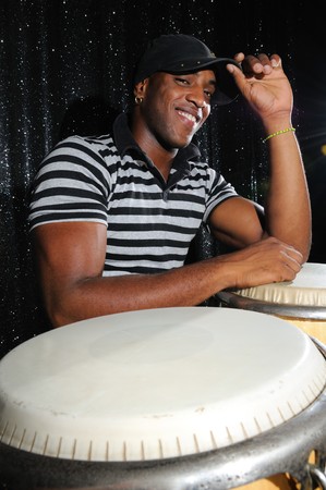 Portrait of young latino percusionist playing african drums
