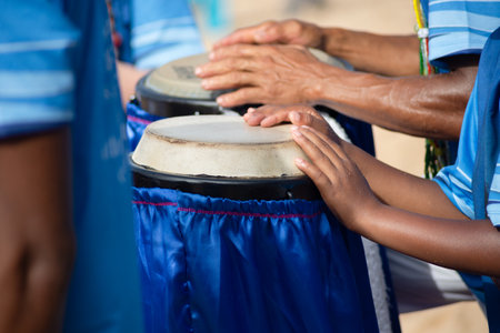 Hands of percussionists play atabaques for iemanja. Salvador, Bahia.