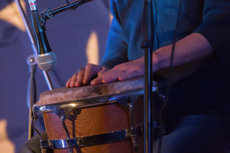 Performers playing bongo drums. Close up of musician hand playing bongos drums. Afro-Cuba, rum, drummer, fingers, hand, hit. Drum. Hands of a musician playing on bongs