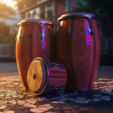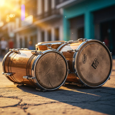 Vibrant conga drums, painted with traditional Cuban patterns, sit on a cobblestone street, ready for a lively performance