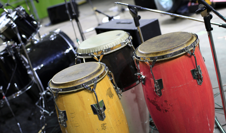 Bongos drums in recording studio for hard beat perfomance. Professional musical instrument for rock and pop show