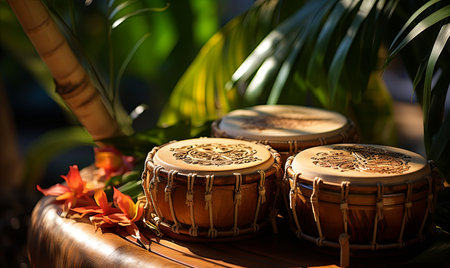 A trio of vibrant conga drums stands out amid lush green plants, embodying the spirit of music and rhythm in a tropical paradise, perfect for cultural and artistic themes.