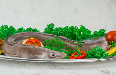 congor,sea eel unprepared with lemon pepper parsley on black board