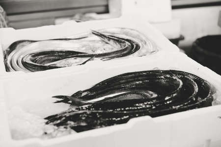 Picture of long fish rounded in store boxes. Black and white image of fresh sea fish on blurred indoor background.
