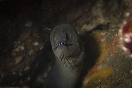 Moray Eel Peeking Out from Hiding Spot Close Up. Concept Underwater Photography, Sea Creatures, Marine Life, Close-Up Portraits, Underwater World