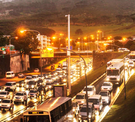 Cars are stuck in a traffic jam on a rainy evening. High quality photo