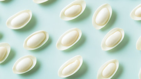 A visually appealing arrangement of white eggs placed in oval dishes, set against a soft blue background, ideal for culinary showcases and food art.