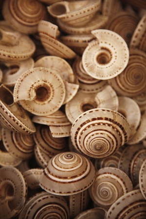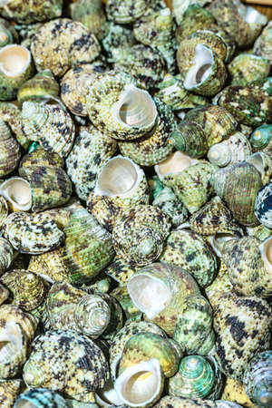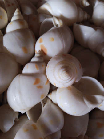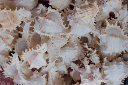 Seashells background. Top view close up of mollusk. Texture of shells top view. Concept group of sea shells. Sea mollusks close-up. Background from exotic shells.