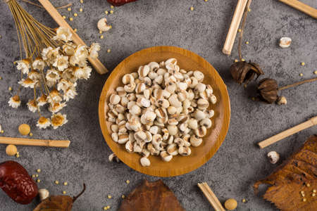Ingredients of Four Tonics Soup, Four Herb Flavor Soup. Taiwanese traditional food with Job's tears, herbs, pork intestines on white background