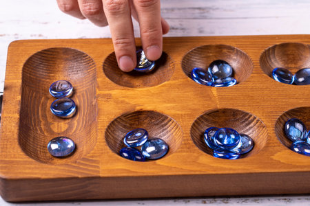 old intelligence games, wooden mancala game, a person playing mancala,