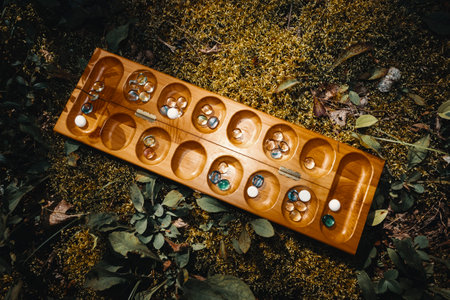 Traditional Mancala boardgame with glass pieces on bed of moss outside