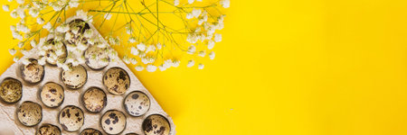 Easter background, various eggs on a yellow background, decorated with natural botanical elements, flat lay, view from above, empty space for text