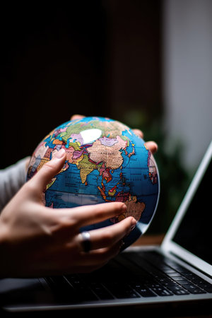 closeup of hands holding a digital globe in front of a laptop, created with generative ai
